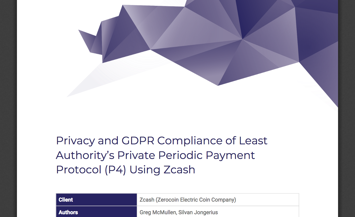 In October 2018, TechGDPR conducted a GDPR compliance assessment of the P4 protocol specification on behalf of the Zcash Company and Least Authority. This assessment reflects important conversations among regulators, compliance advisors, and implementers of blockchain and other cutting edge technologies in the context of the GDPR and other privacy-protecting regulations.
